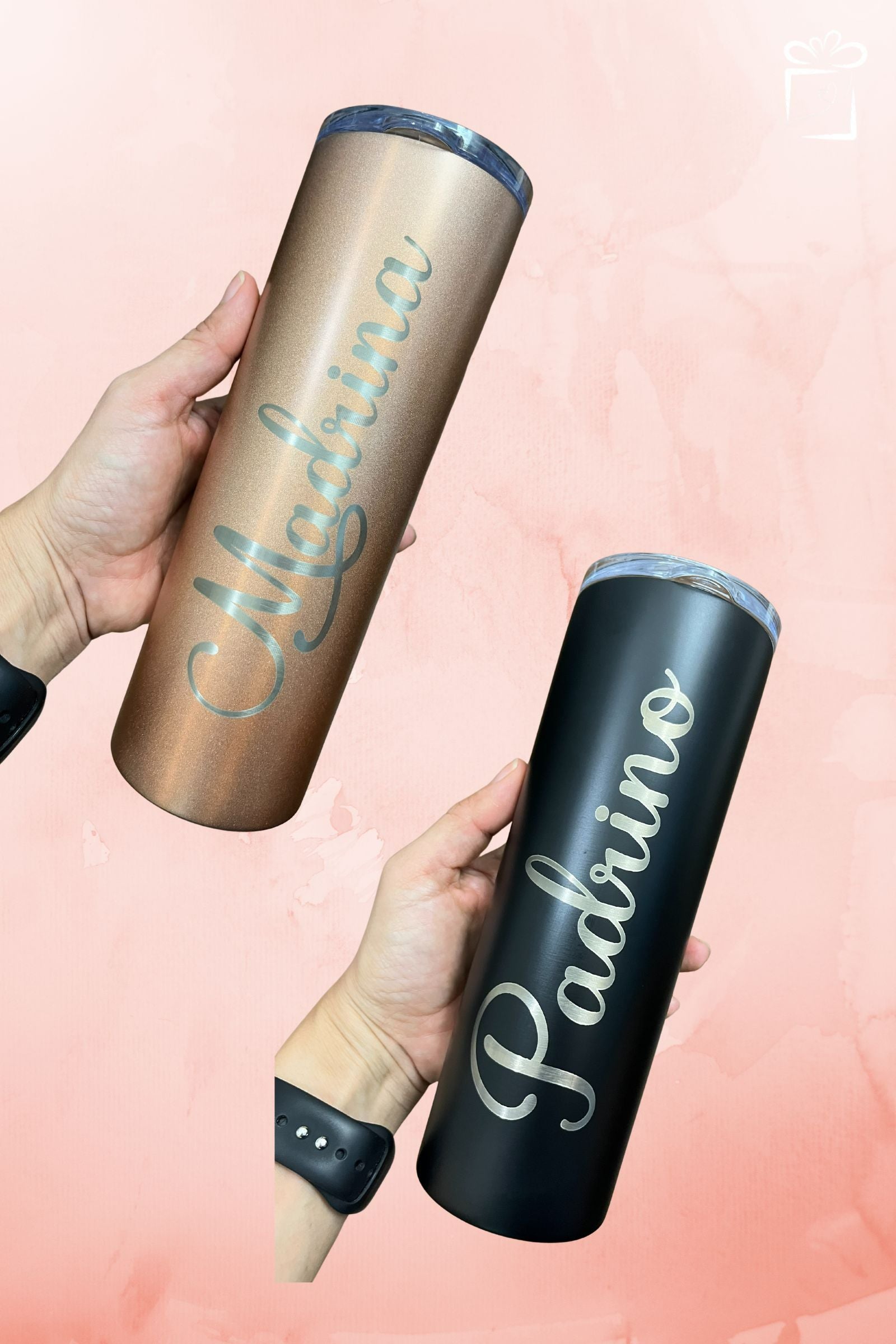 Beautiful custom box personalized with godparents' names. Contains one or two 22oz stainless steel tumblers with straw, laser engraved for godparents (available in three colors: black, white, and pink gold), and a white personalized baby bodysuit with the proposal.