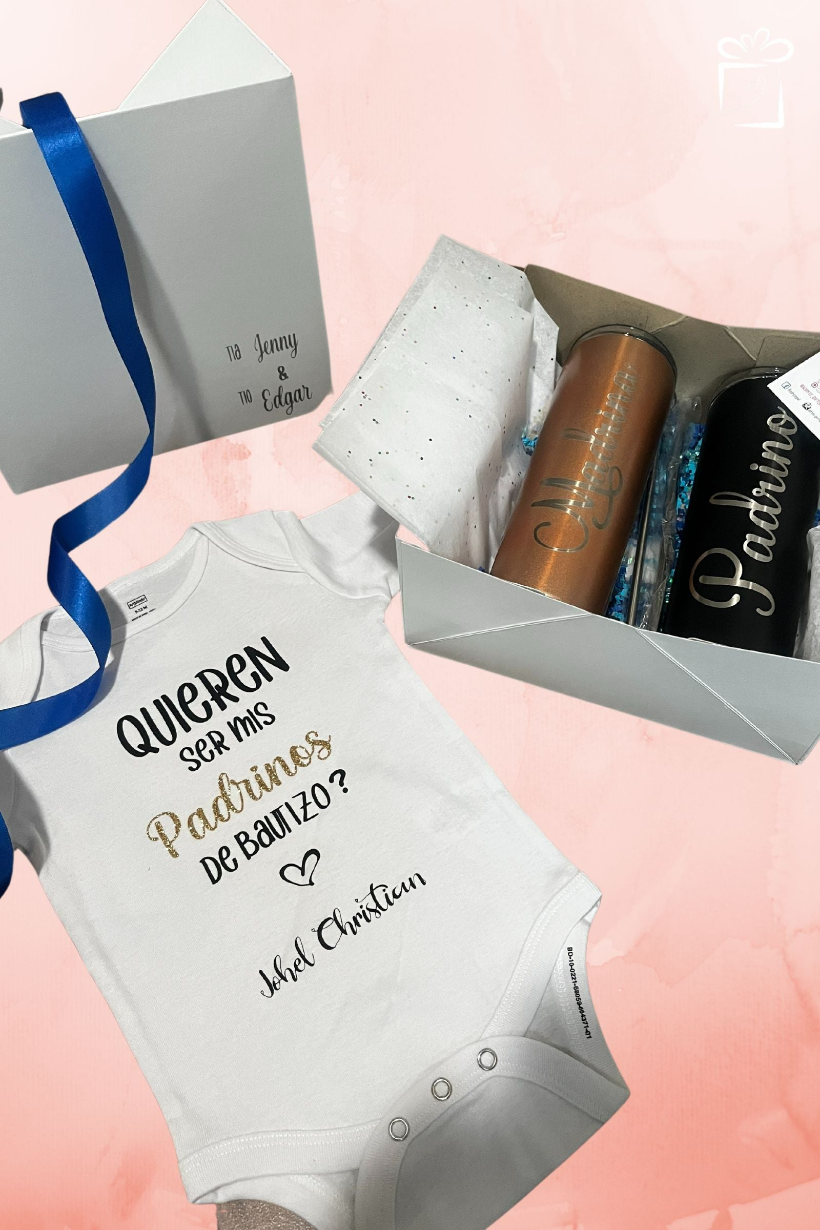 Beautiful custom box personalized with godparents' names. Contains one or two 22oz stainless steel tumblers with straw, laser engraved for godparents (available in three colors: black, white, and pink gold), and a white personalized baby bodysuit with the proposal.